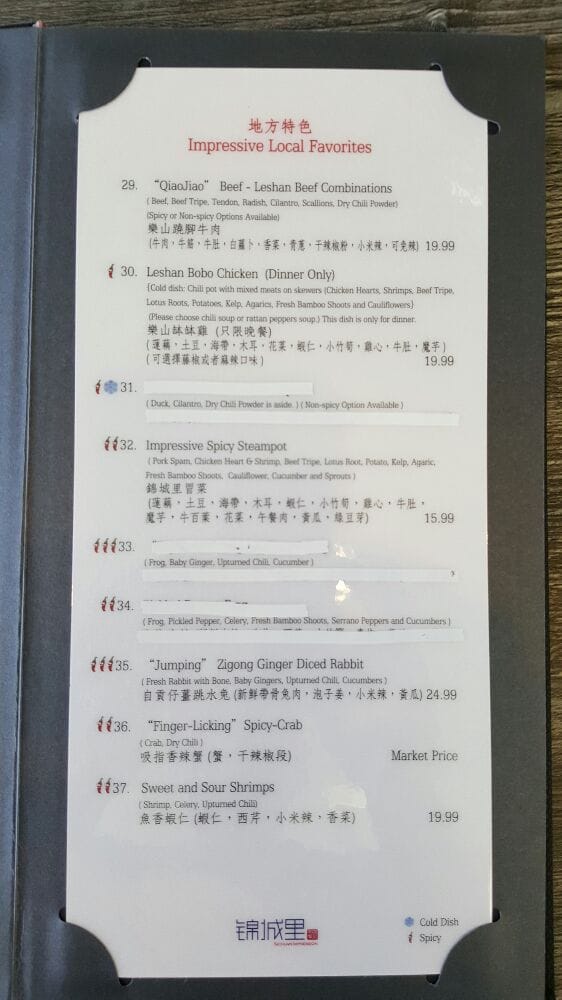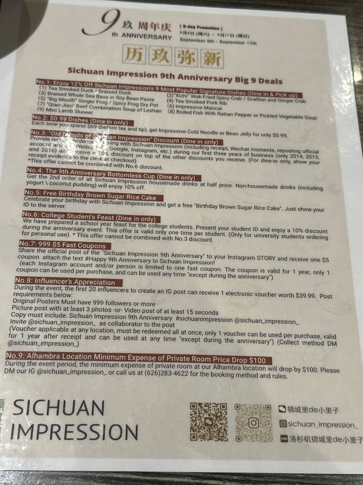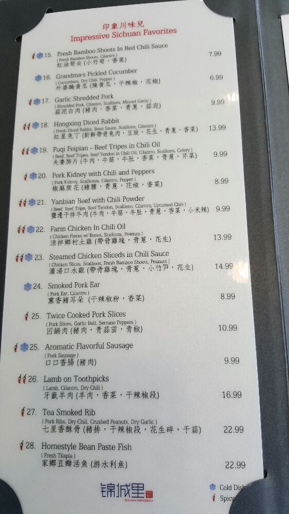 Sichuan Impression in Tustin, CA offers a unique dining experience with its Asian Fusion - Chinese cuisine. The menu includes a wide range of spicy and flavorful dishes, such as Spicy Grilled Sea Bass, Scallion and Garlic Crab, and Signature Braised Duck. Customers rave about the Toothpick Lamb, Home Styled Fried Rice, and Impressive Cold Noodles. The restaurant is known for its friendly service and thoughtful staff. Despite some mixed reviews about the service, the quality of the food stands out. The spicy dishes may not be for everyone, but those who enjoy mala flavors will be pleased. Overall, Sichuan Impression is highly recommended for those looking for authentic and bold flavors in their Chinese cuisine experience.
